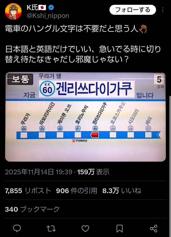 電車の液晶の『ハングル表記』、またまた批判されバズってしまう