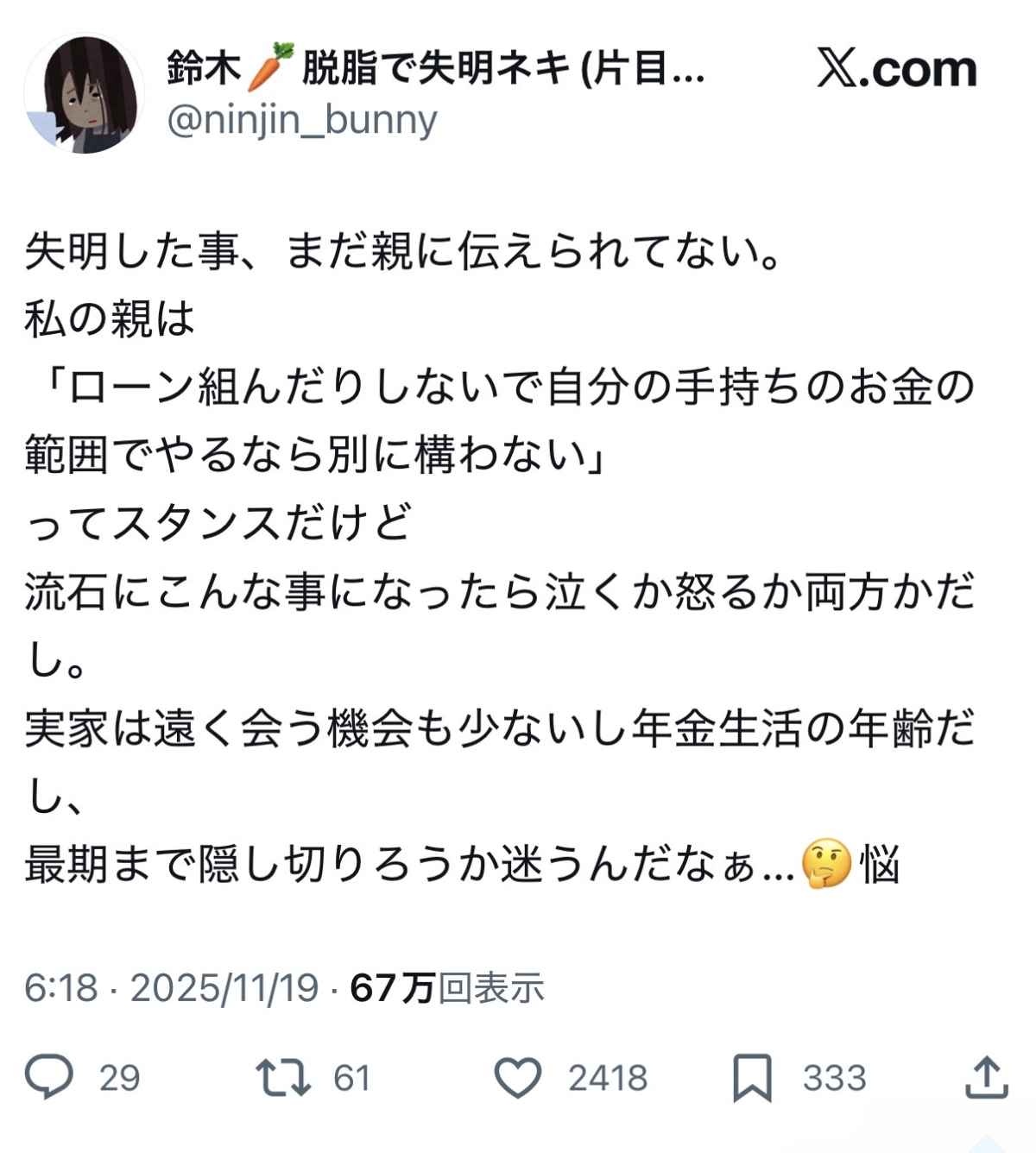 そういうリスクも説明されとるやろうし - 31 : 2025/11/19(水) 16:17:16.999 ID:2qVGTB60B