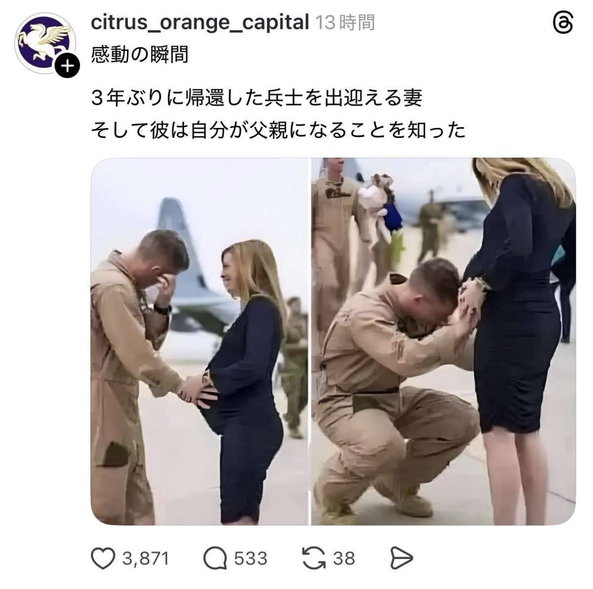 【感動】3年ぶりに帰還した兵士、自分が父親になることを知る