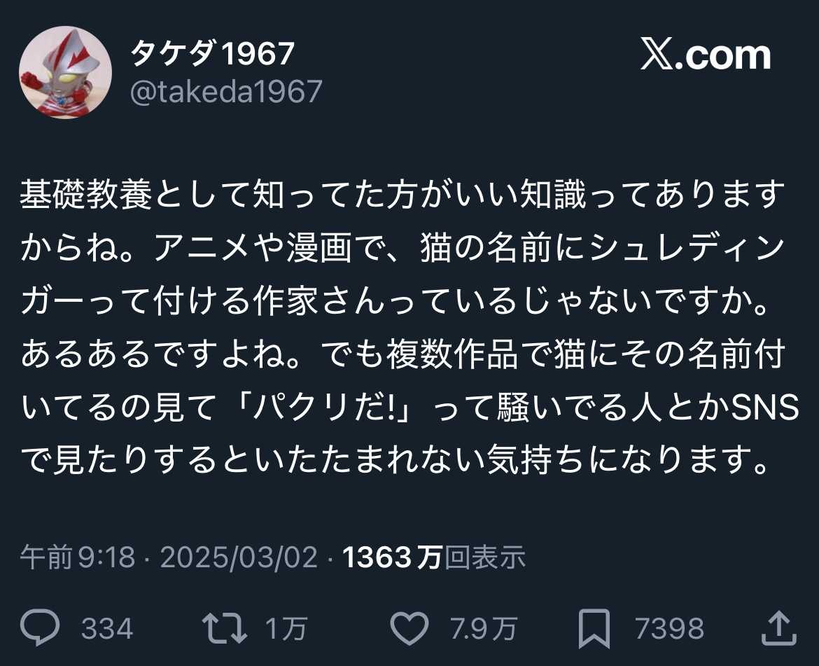 「シュレディンガーの猫は教養」とかほざいてるツイートなら冷笑されて然るべきやが、これはあくまで例え話やからな - 13 : 2025/11/30(日) 21:33:04.803 ID:Bf3TPhCgm