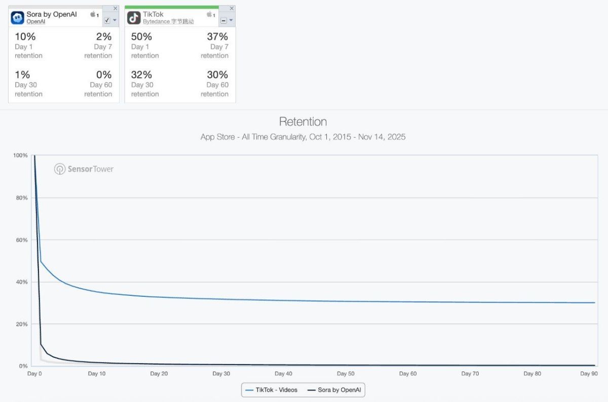 OpenAIさんの動画生成SNS『Sora』、一日で90%、一週間で98%、一ヶ月で99%の人が飽きて辞めていた💸💸