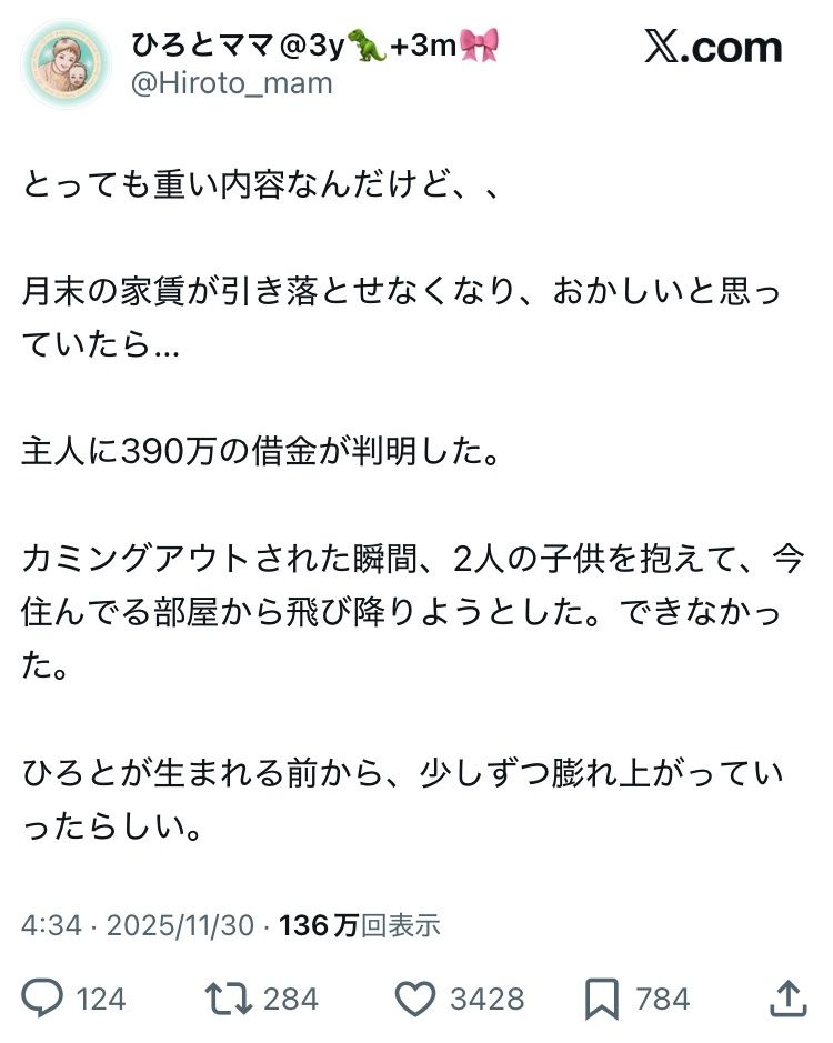 ママ、夫に借金(390万)が発覚した瞬間子ども2人とマンションから飛び降り無理心中自殺
