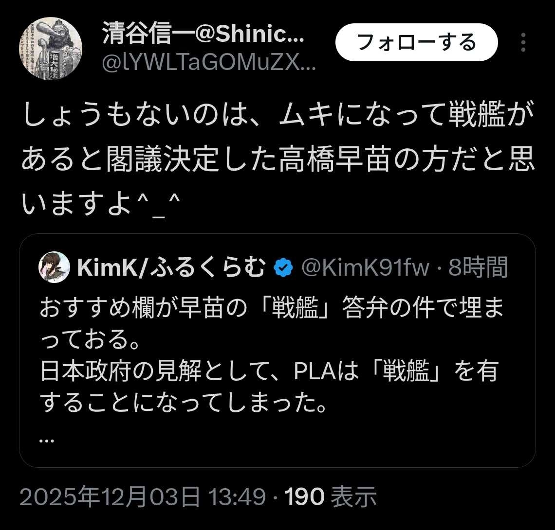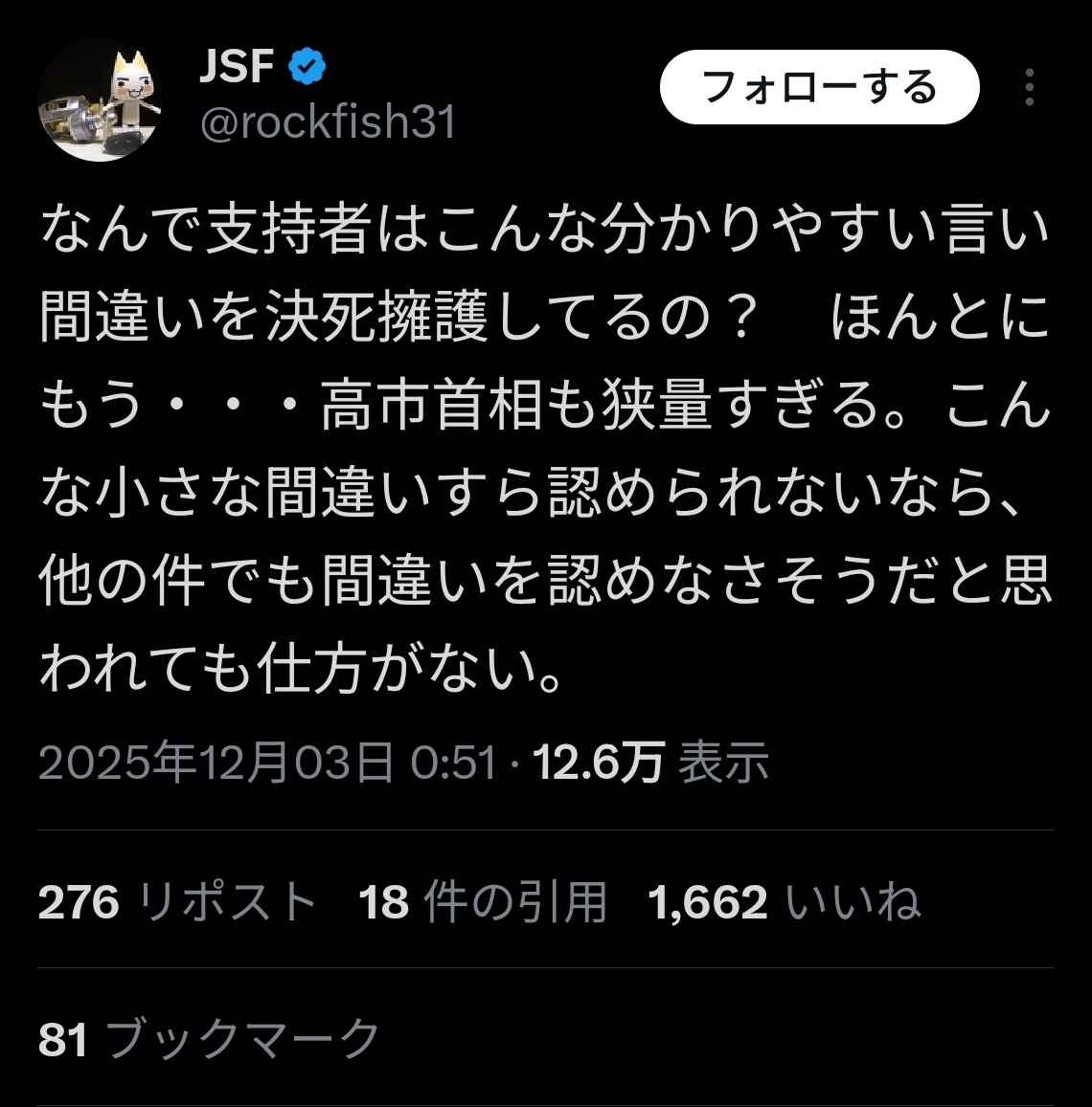 高市が勝手に意地張ってるだけならともかく狂信者が殺しに来る勢いで抹殺しようとするからな - 32 : 2025/12/03(水) 16:12:17.095 ID:oZMQVYrRz