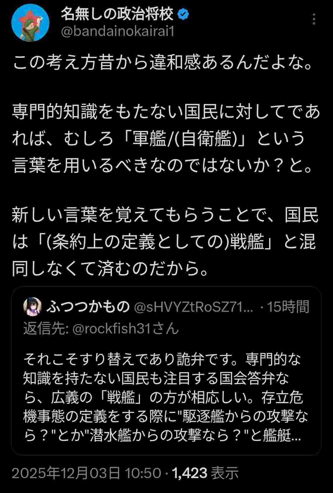 - 結局、意地を張ってあの答弁を戦艦に限定したことで、いざ中国が軍艦を出してきたらどうなるか誰も分からんの草