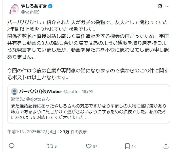 素性を明かさずにミステリアスな動画を出し続けていた”あの”バーバパパさんが、今回素性を明かさずを得なくなり、ブランド価値が毀損されたらしい… - 6 : 2025/12/04(木) 02:12:11.101 ID:D0uz0DTD9