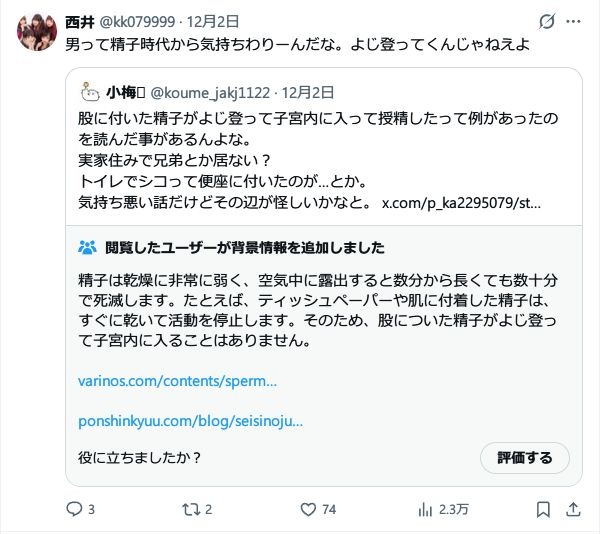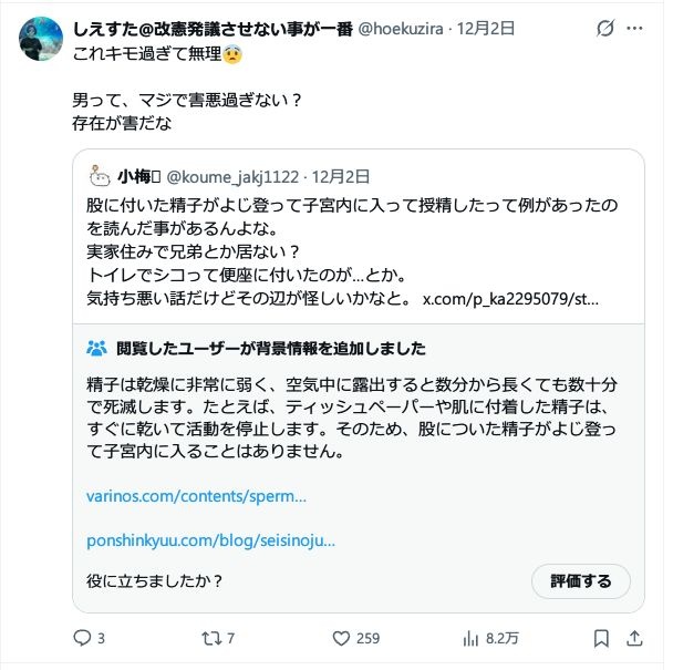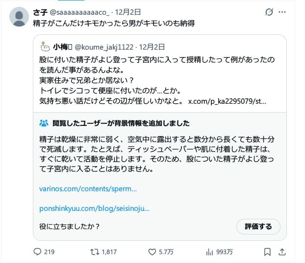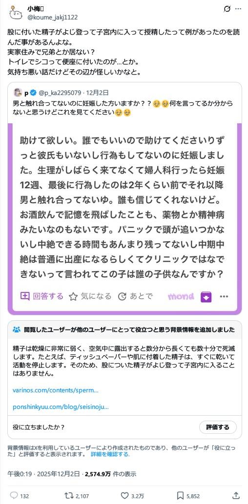 Xまんさん、「股についた精子がよじ登って子宮内に入り妊娠した」という話を信じて万バズさせてしまうwww