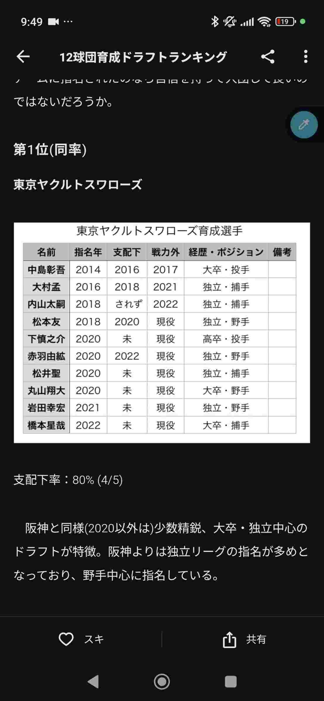 - ヤクルトは少数で支配下率めっちゃ高いんやな