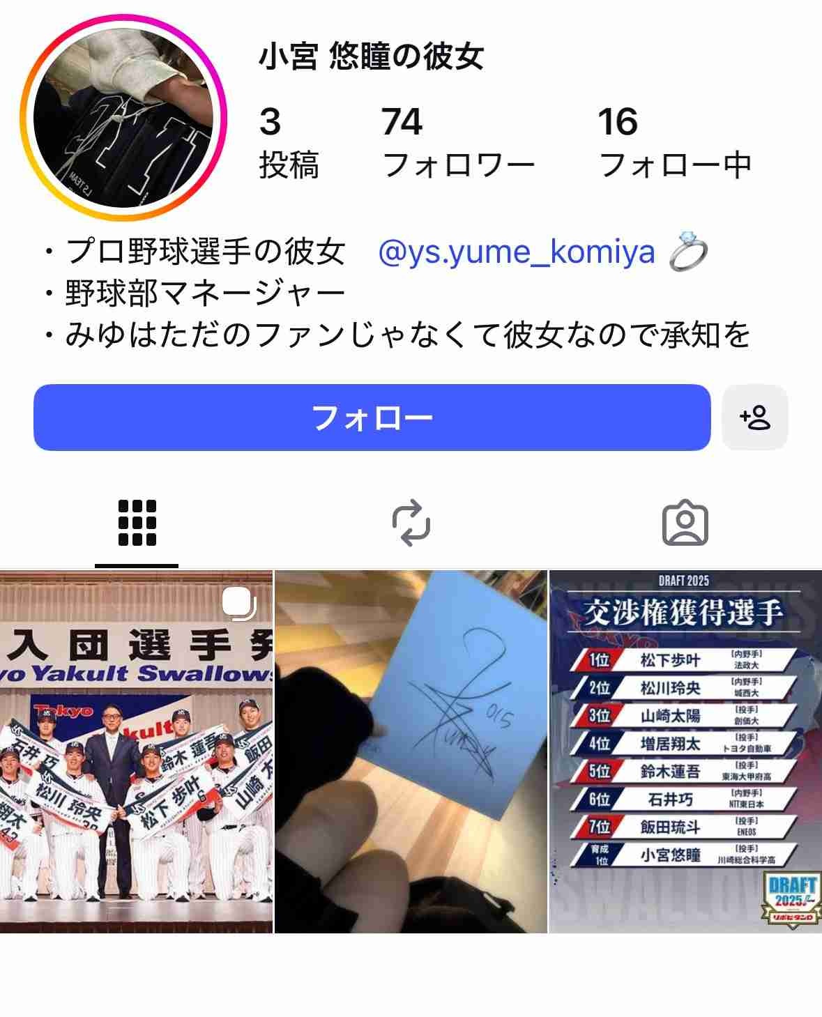 ヤクルト育成1位、小宮悠瞳くんの彼女