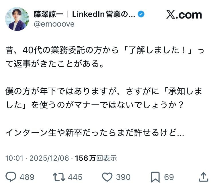 20代ベンチャー社長「業務委託の40代おっさんに「了解しました」って言われた。敬語も使えないとか常識無いんか?」www