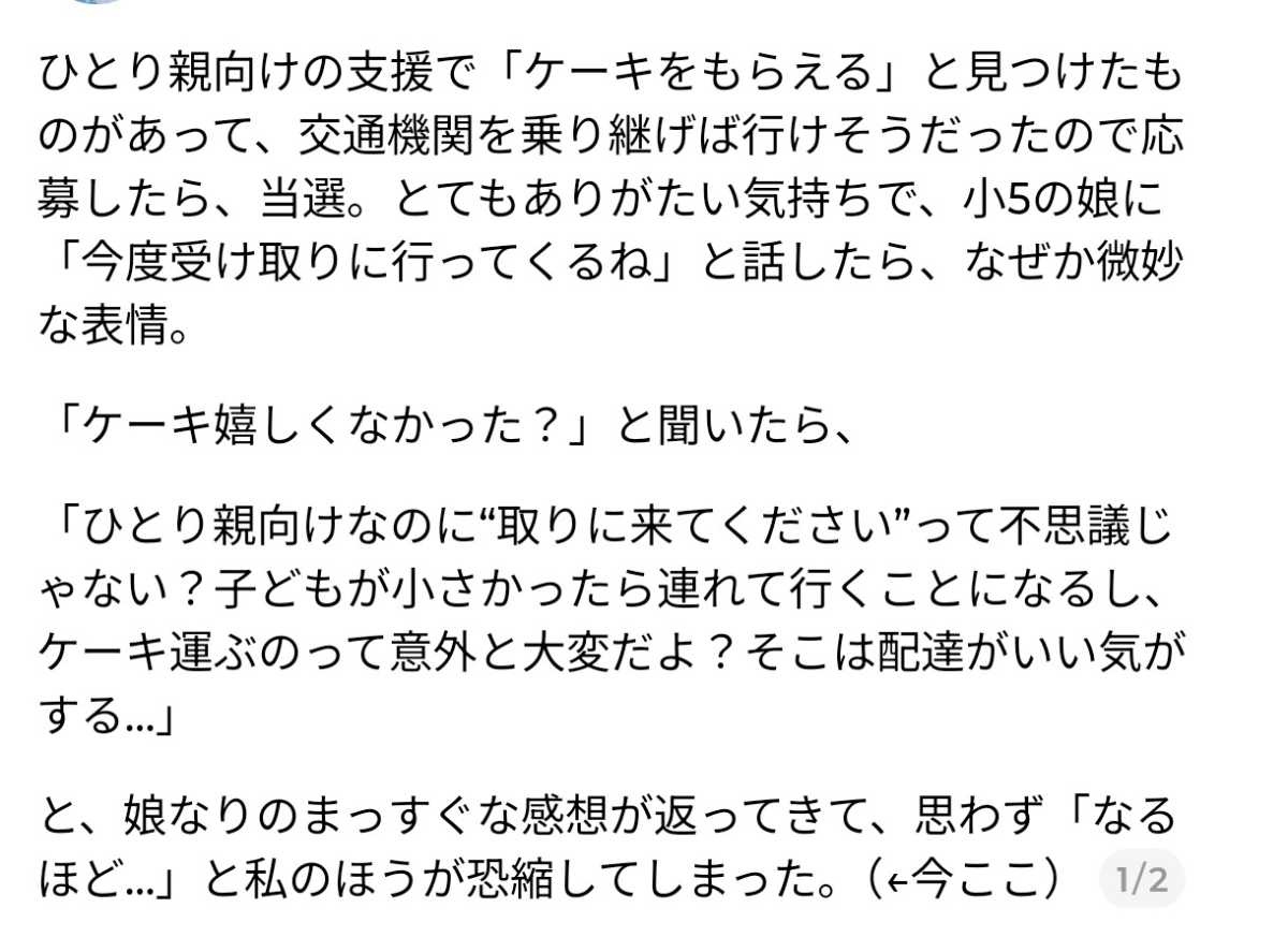 - ひとり親向けの支援で「ケーキをもらえる」と見つけたものがあって、交通機関を乗り継げば行けそうだったので応募したら、当選。とてもありがたい気持ちで、小5の娘に「今度受け取りに行ってくるね」と話したら、なぜか微妙な表情。