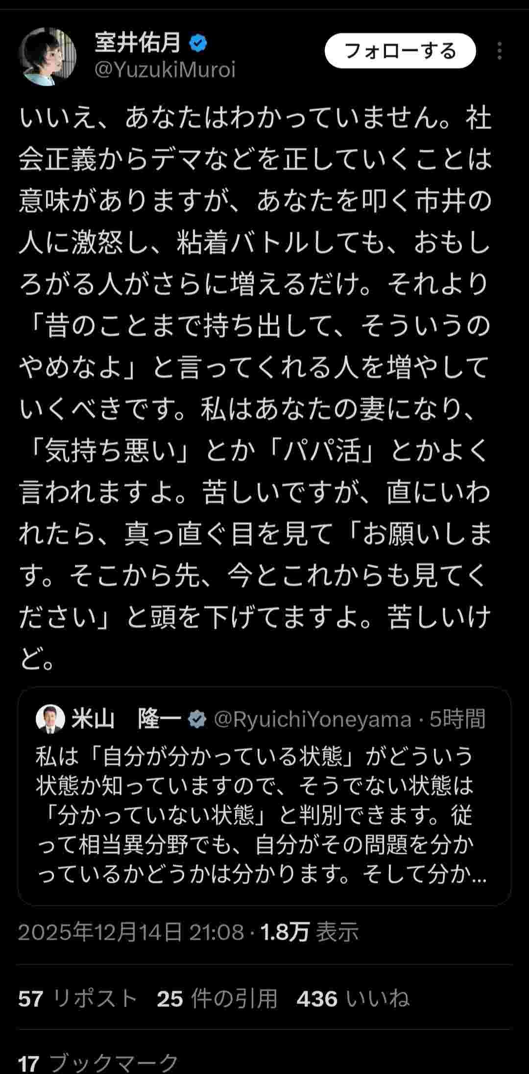 夫婦喧嘩をオープンなSNS上でやるなみっともない - 21 : 2025/12/14(日) 21:51:39.776 ID:pAXSo1mGf