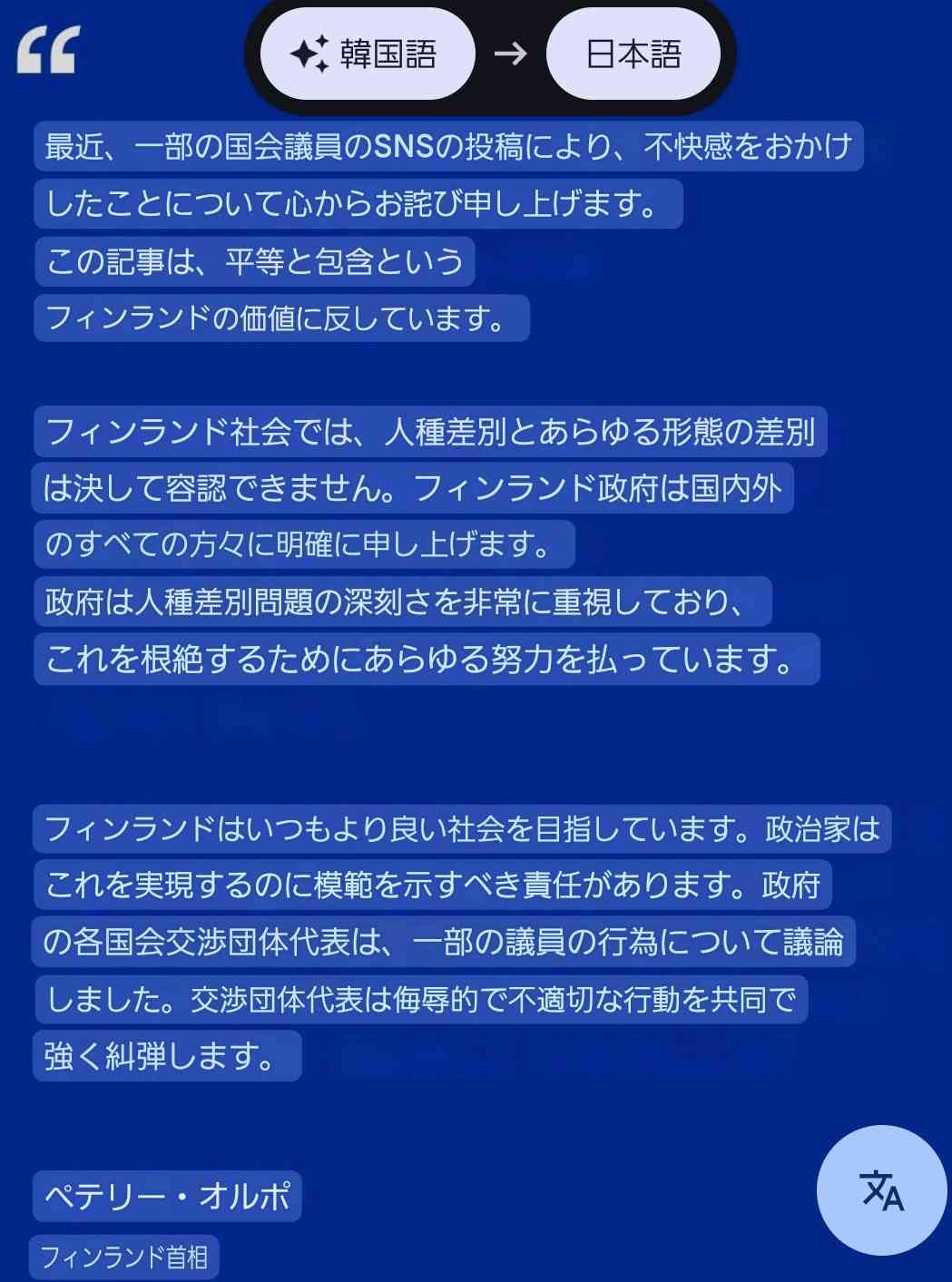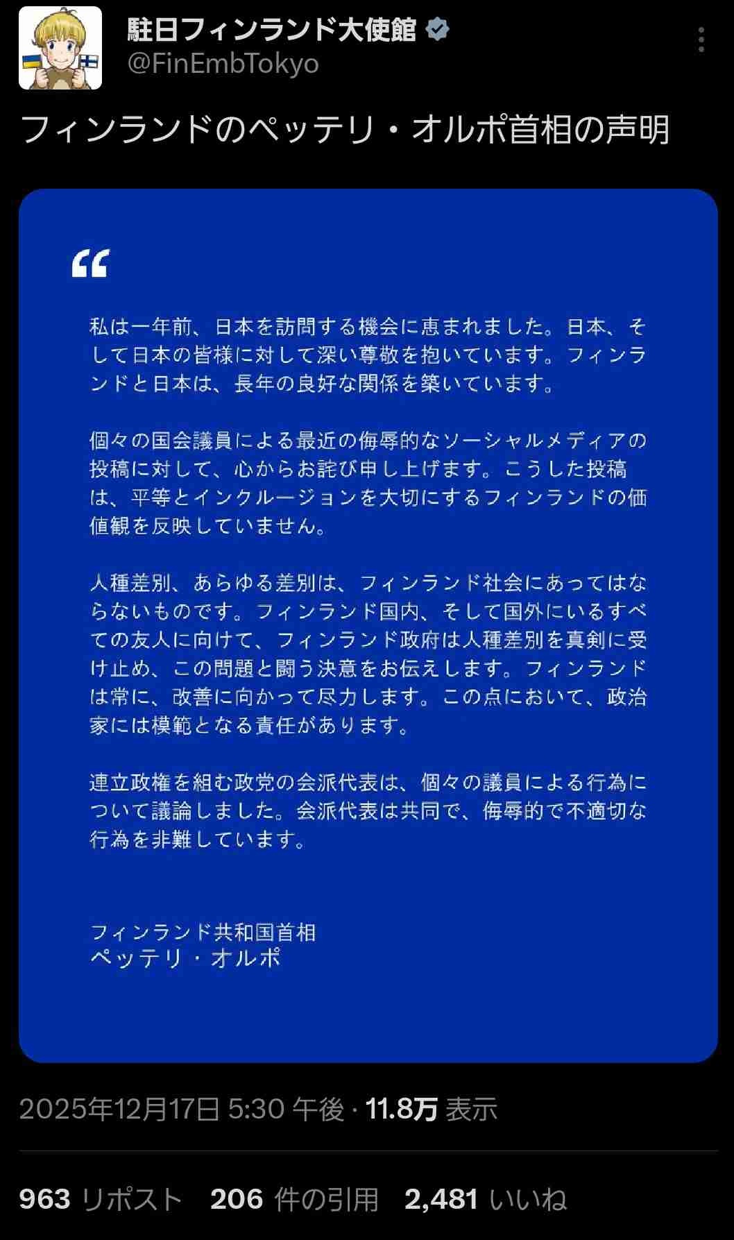 - なおこの声明を見てもフィンランドの人たちは反省してないんだあああというコメントが溢れている模様