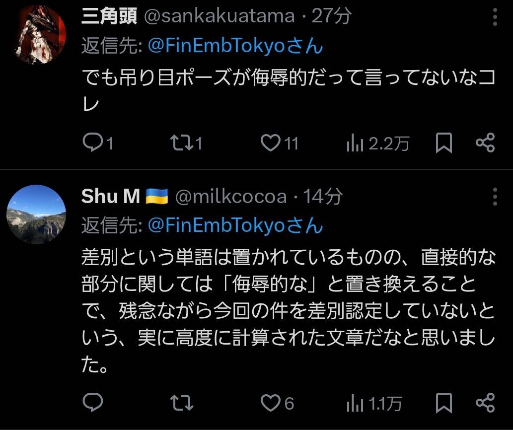 - なおリプ欄の日本人は、フィンランド政府は差別行為であったと認めてないんだああああと発狂