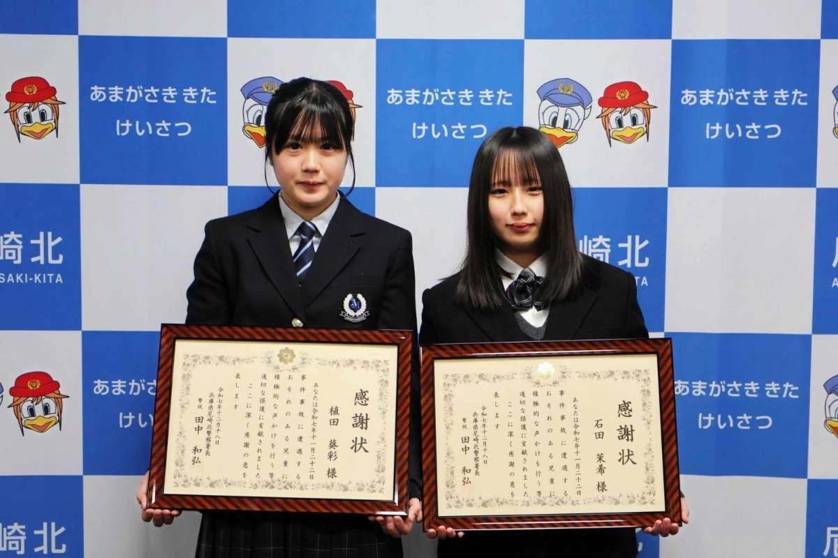 【尼崎】公園に1人でいた小学6年の男児を家まで送り届けたとして、JK2人に感謝状