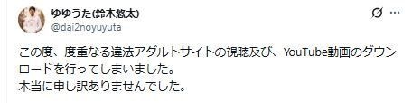 「この度、度重なる違法アダルトサイトの視聴及び、YouTube動画のダウンロードを行ってしまいました。本当に申し訳ありませんでした」とつづり、謝罪した。