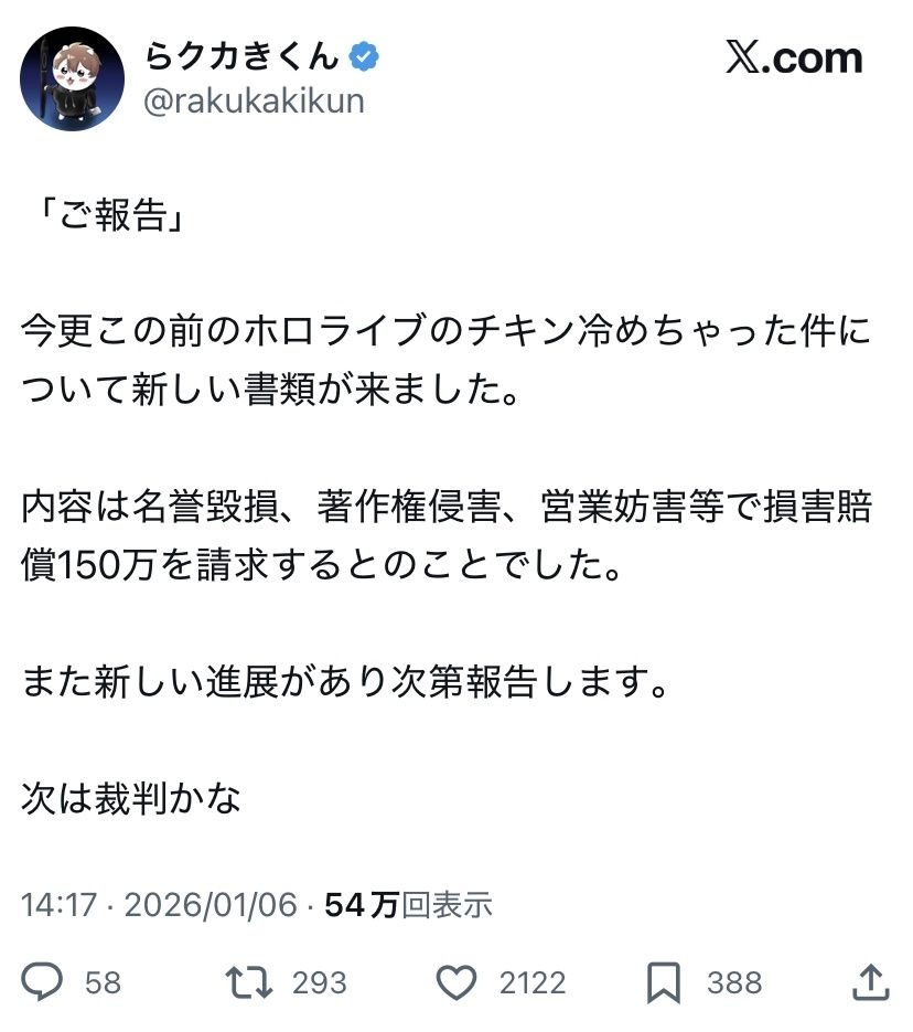 著作権が一番通ると思う。名誉毀損、営業妨害は微妙な気もする - 69 : 2026/01/06(火) 17:14:21.049 ID:Q9Ia3wUhZ