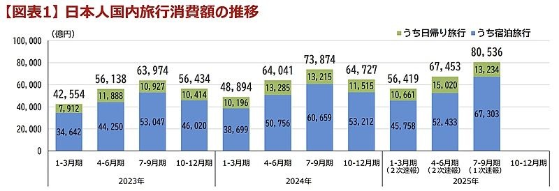 一方、日本人の国内旅行の1人1回あたり旅行支出(旅行単価)は、同4.2%増の4万9912円。宿泊旅行が同5.3%増の7万4485円、日帰り旅行が同3.4%減の1万8639円だった。