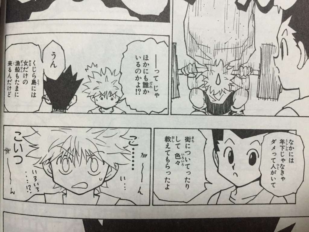 - モラウが「王が子作り中だったからピトーは円を止めたんだろ」って議論してた場面でキルアが「ゴンには意味は伝わらないだろうな…」って言ってたからキルア目線ではゴンは童貞