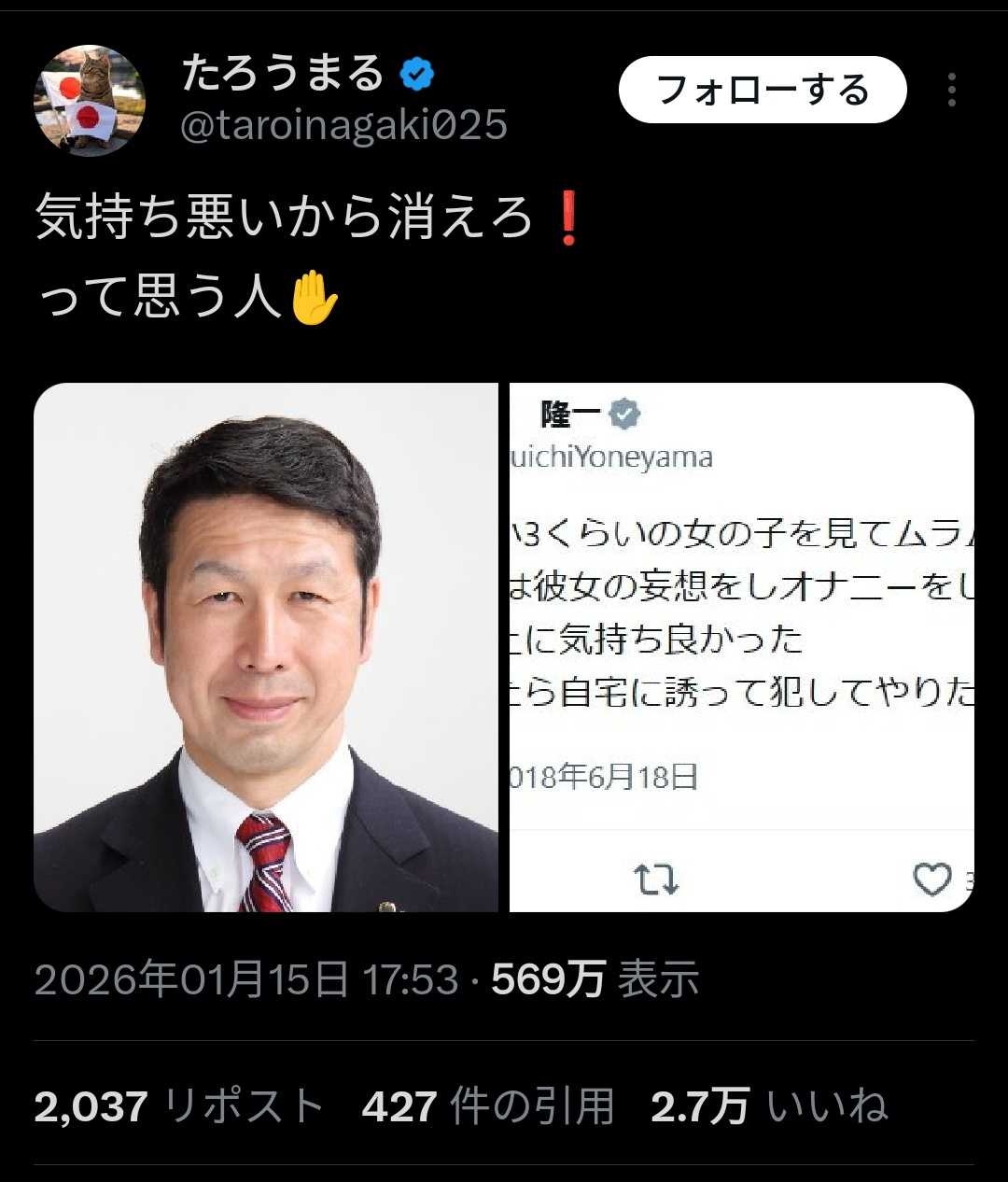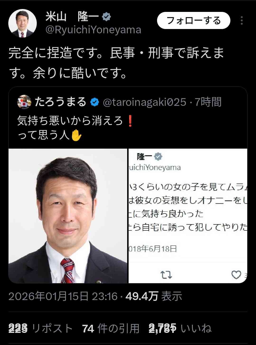 米山隆一、ロリコンなりすましデマツイートにブチギレ即訴訟宣言www