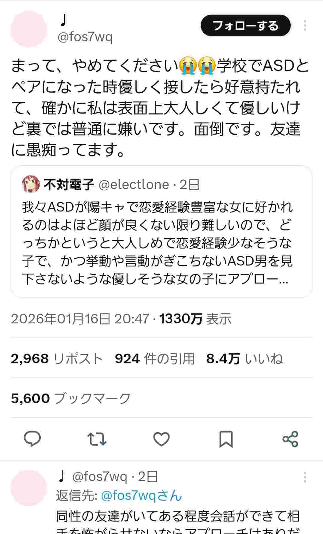 こういう勘違いゲェジにつきまとわれることを本能的に知っている、もしくは身を持って経験したから成長するにつれてASDに優しくしてくれる女は減っていくんや