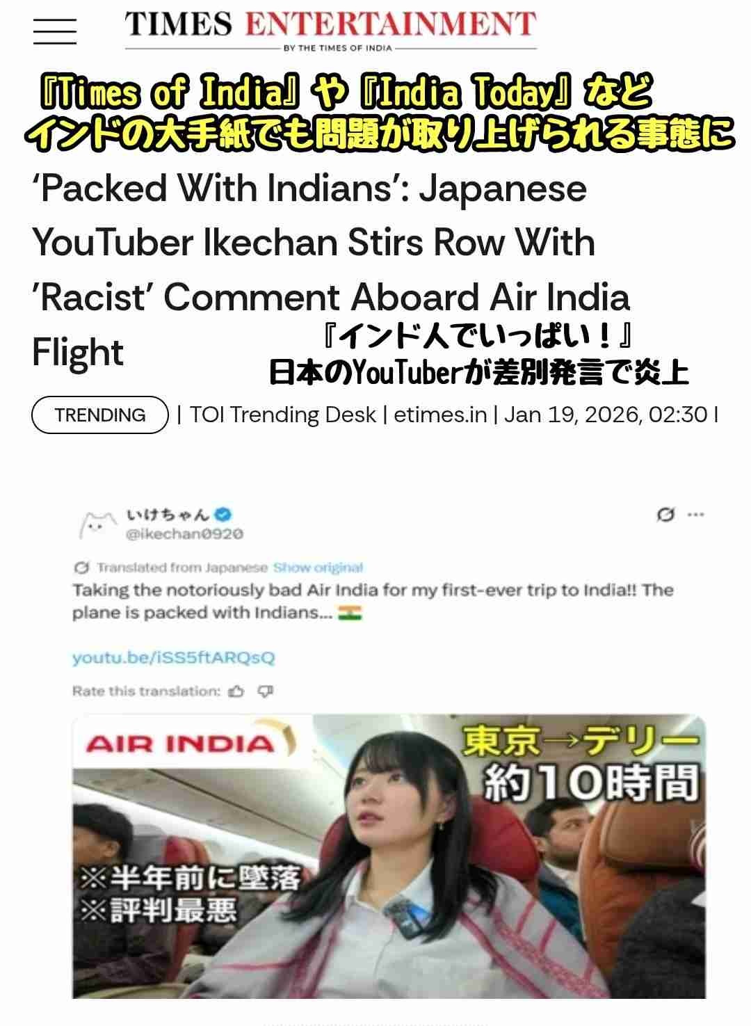 数百名が死亡した飛行機事故をイジりつつ「インドは世界一汚ない国」と発言