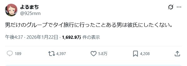 👩「男だけのグループで『タイ旅行』に行ったことある男は彼氏にしたくない。」 →5.8万イイネ