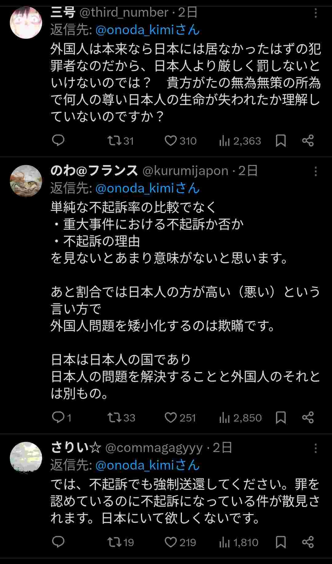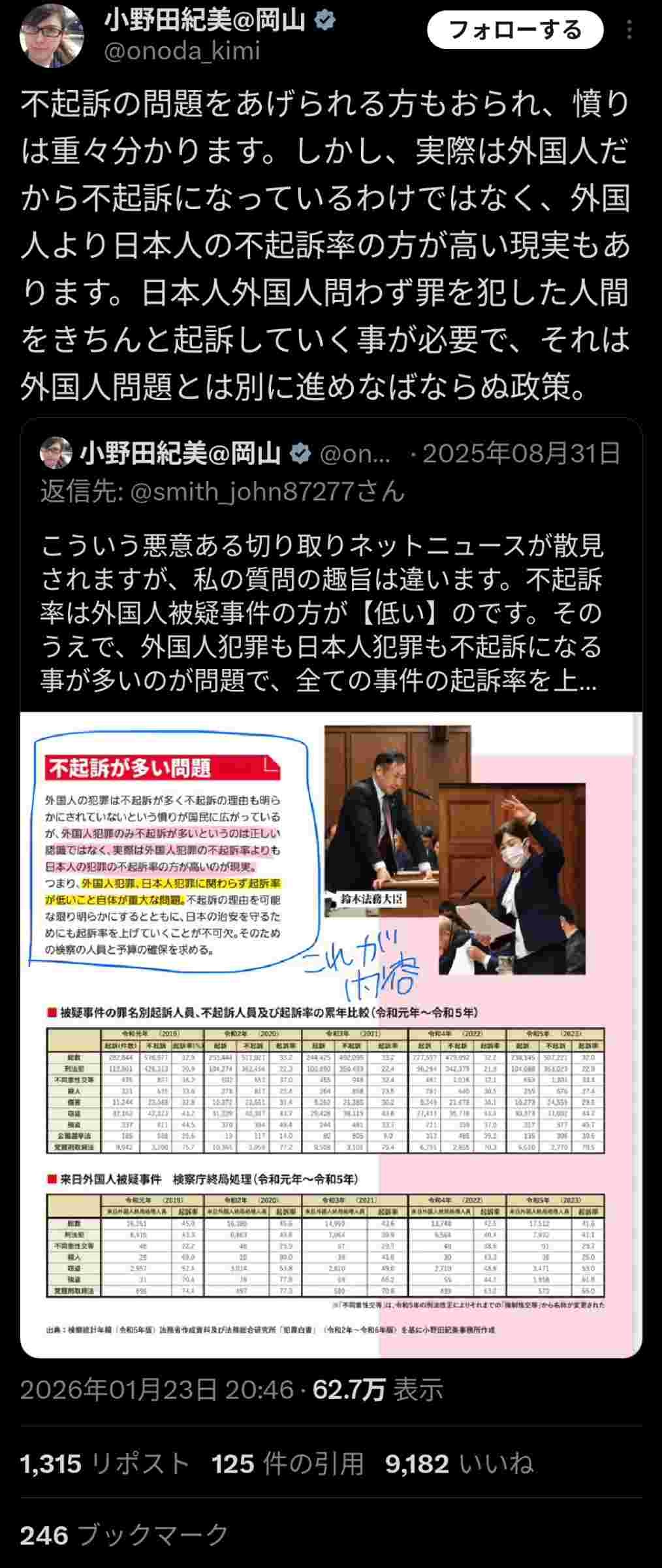 小野田紀美、覚醒「数字を見てください。日本人の方が不起訴率高いんです。外国人は不起訴なんてデマです」→ネトウヨ大発狂錯乱