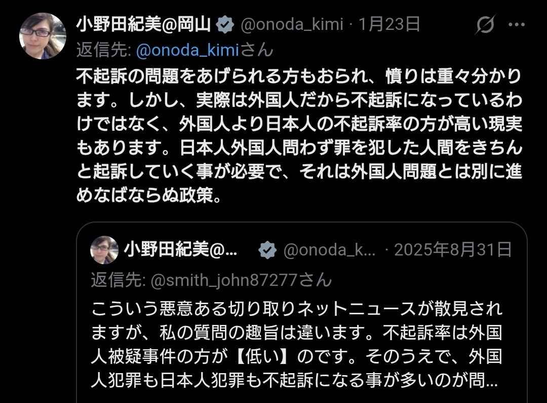 小野田紀美「なんか怒ってるけど外国人の方が日本人より起訴率は高い。デマで暴れるのやめようや」愛国者「えっ?!!?!!??!」
