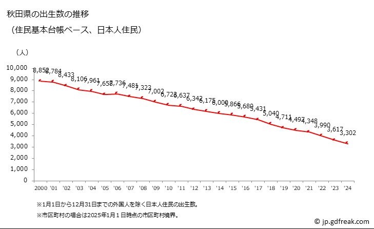 ワイの生まれ故郷秋田県の令和7年の出生数・・・
