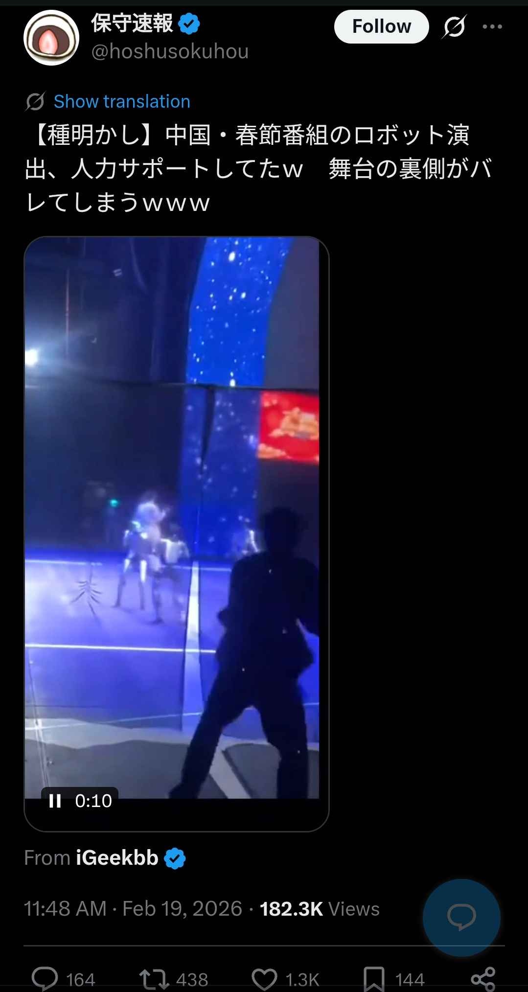 中国の春節番組のロボット、人力でラジコンを動かしてるだけだったwww