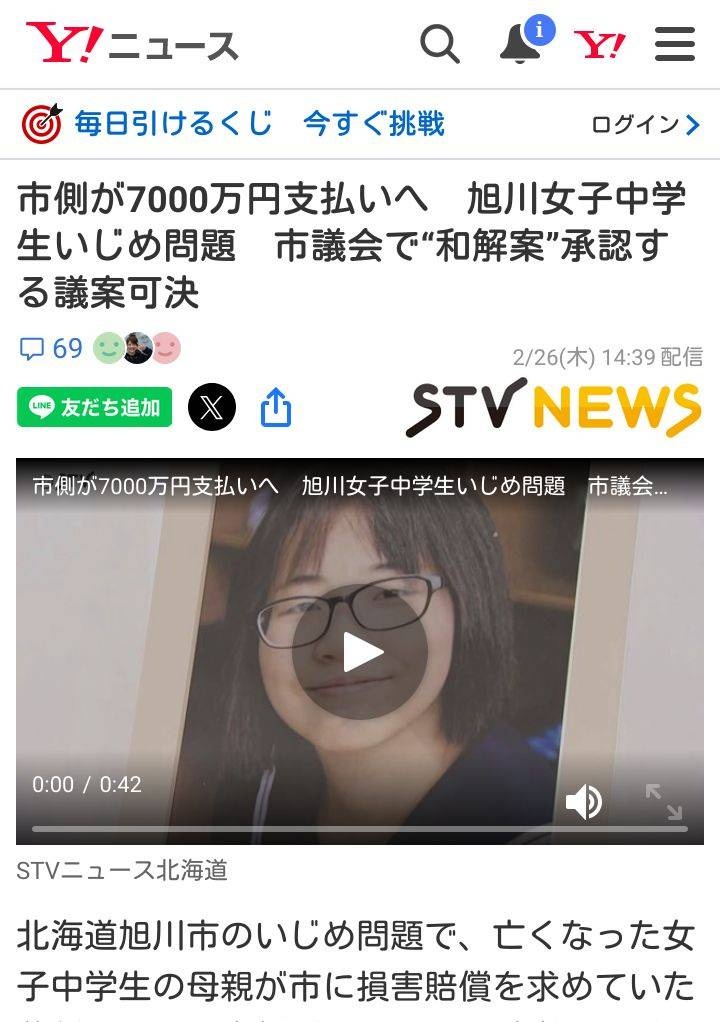 旭川中学生女子いじめ自殺で市が7000万円支払い和解www