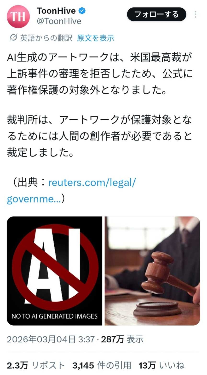 生成AI完全終了、最高裁がAIが作った物には著作権が産まれないことを認めた模様