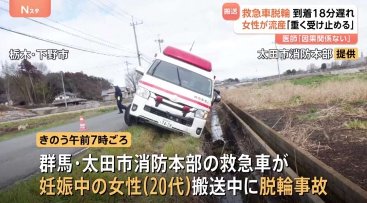妊娠中の女性搬送中に救急車が脱輪事故 搬送遅れその後流産 道幅狭い道路で対向のトラック避け側溝に脱輪 消防「重く受け止め」 病院の医師は「因果関係なし」と説明 | TBS NEWS DIG (1ページ)群馬県の太田市消防本部は救急車が妊娠中の女性を搬送中に脱輪する事故を起こして、病院への到着が18分遅れ、女性が流産したときょう(5日)発表しました。太田市消防本部によりますと、きのう午前5時前、群馬県太… (1ページ)newsdig.tbs.co.jp - 2 : 2026/03/05(木) 21:13:03.265 ID:40KWAkDzA