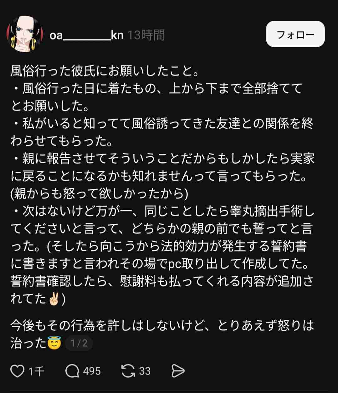 ・次はないけど万が一、同じことしたら睾丸摘出手術してくださいと言って、どちらかの親の前でも誓ってと言った。(そしたら向こうから法的効力が発生する誓約書に書きますと言われその場でpc取り出して作成してた。誓約書確認したら、慰謝料も払ってくれる内容が追加されてた✌🏻)今後もその行為を許しはしないけど、とりあえず怒りは治った😇