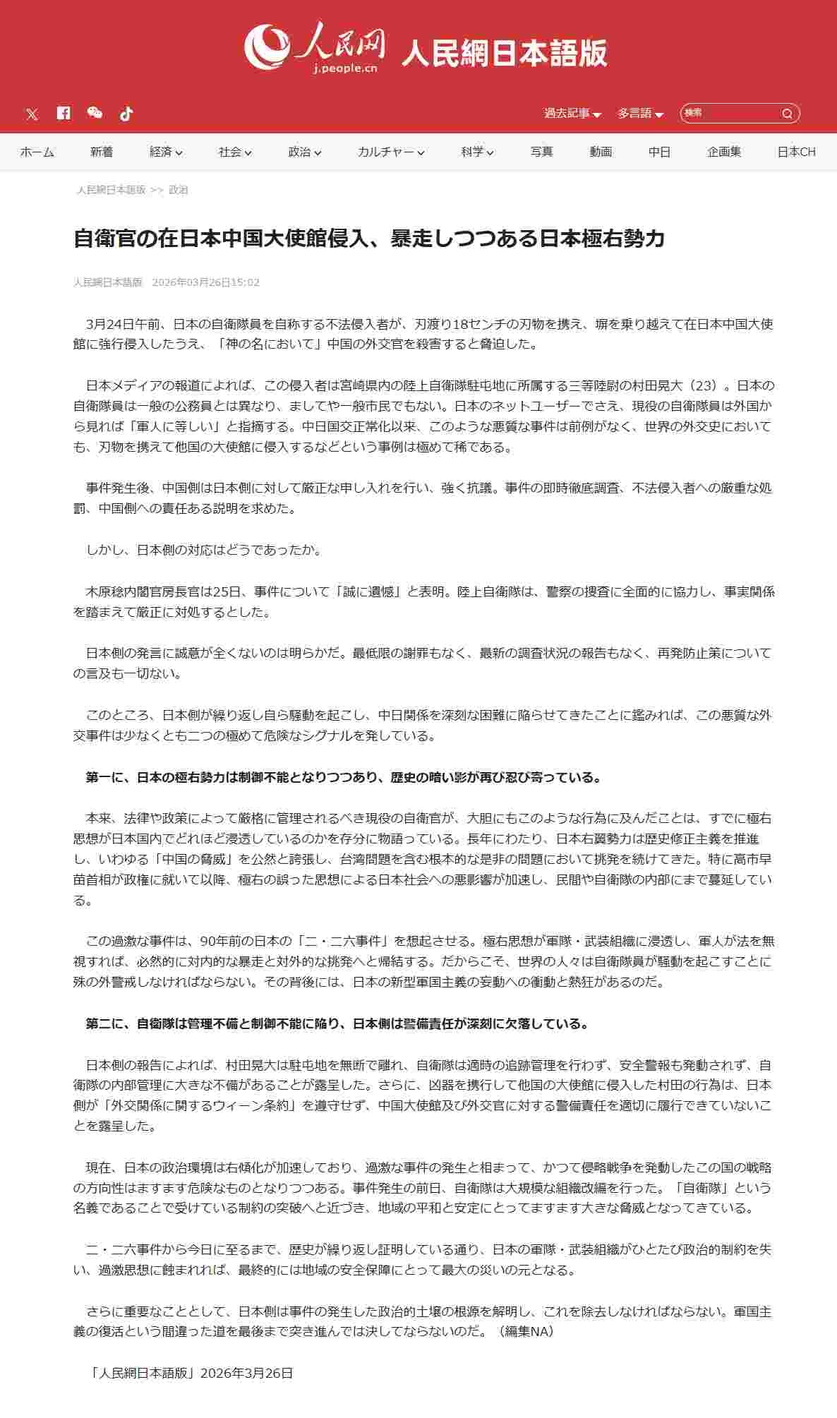 - 3月24日午前、日本の自衛隊員を自称する不法侵入者が、刃渡り18センチの刃物を携え、塀を乗り越えて在日本中国大使館に強行侵入したうえ、