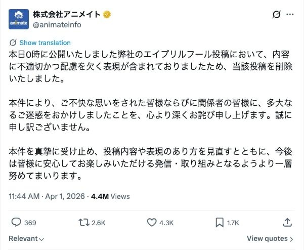 - アニメイトは4月1日、エイプリルフールの投稿に「不適切かつ配慮を欠く表現」が含まれていたとして謝罪した。同社は架空の乙女ゲームをプロデュースしたとXに投稿していたが、BL展開を匂わせる内容が含まれていた。