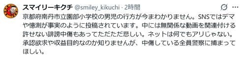 キクチは「京都小6・安達結希さん(11)行方不明で不可解な謎が浮上…『リュックは第三者が置いた可能性』『かく乱目的か』元刑事が現場を分析」との見出しが付けられた記事を引用。「京都府南丹市立園部小学校の男児の行方が今まわかりません。SNSではデマや憶測が事実のように投稿されています」と言及した。