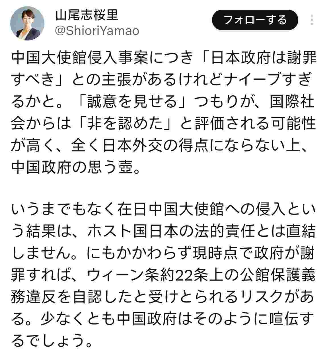 【正論】山尾志桜里さん「中国大使館問題を謝罪するとこの案件の非を認めることになり中国の思う壷」