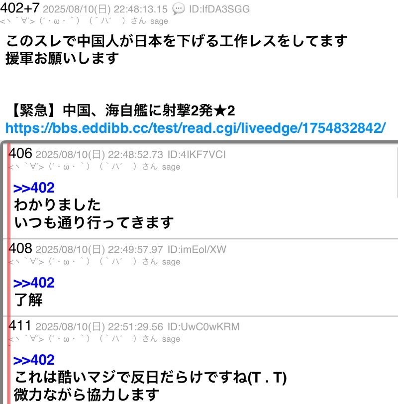 彡(🇯🇵)(🇯🇵)「エッヂという板で中国人が暴れています。援軍要請します。」 東亜板民「了解」ガチャッ ←結果
