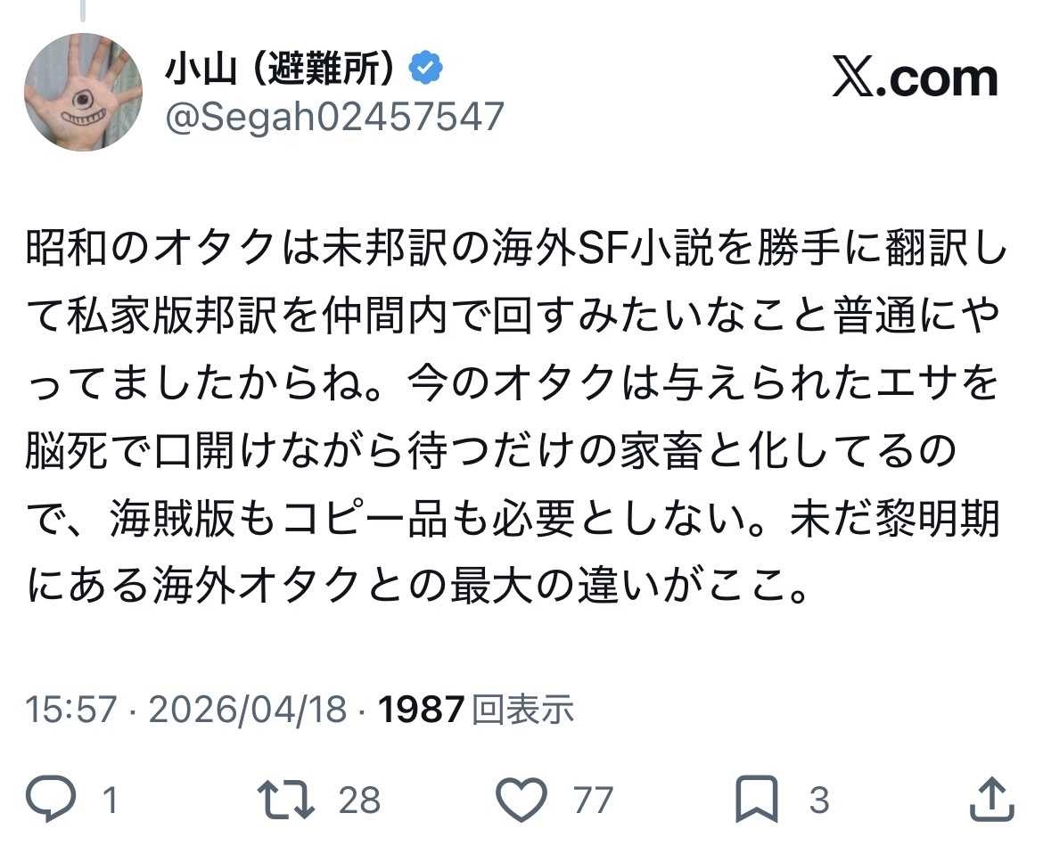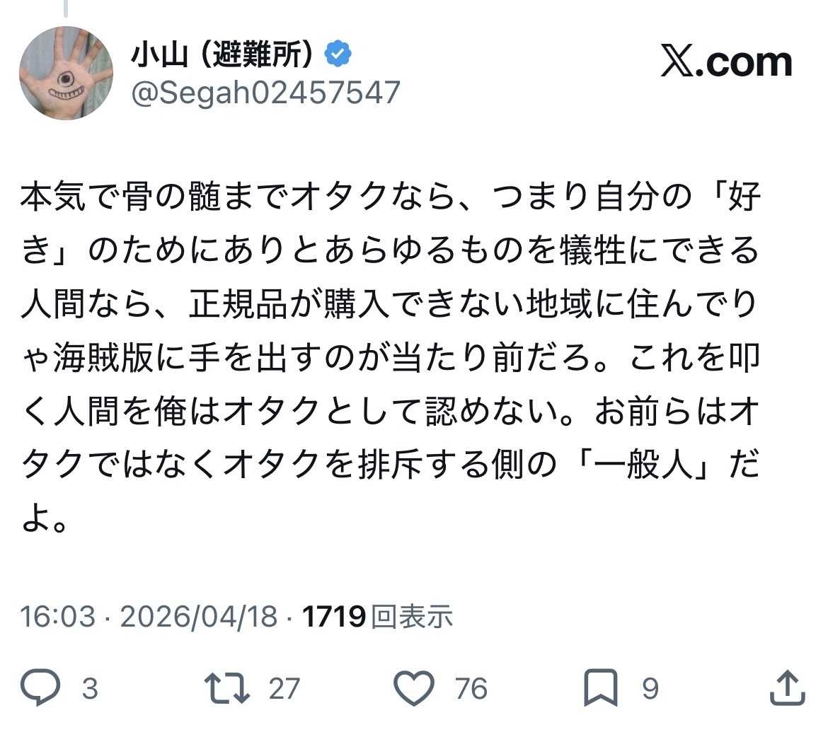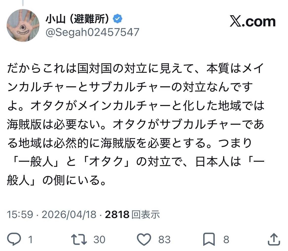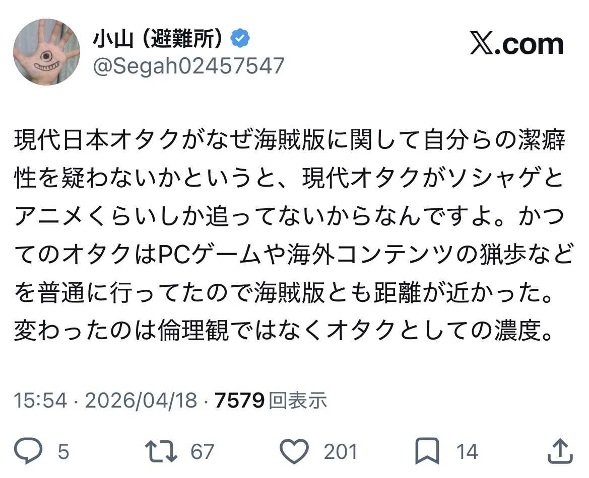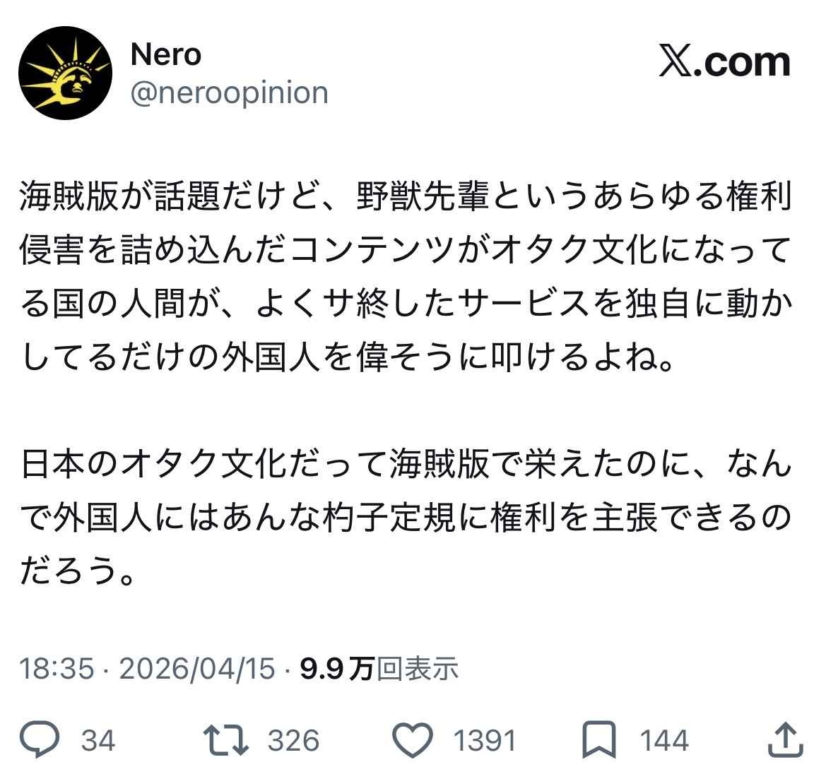著作権侵害って親告罪なのに部外者が騒いでる時点で公式側に立つことで自分を公式側に寄せて気持ち良くなりたいだけやろ思う