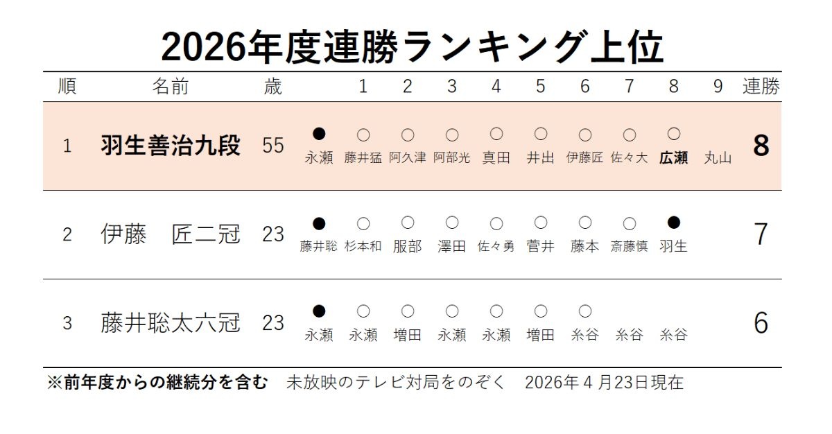 将棋 羽生善治(55)さん、8連勝で連勝ランキング単独1位に躍り出る