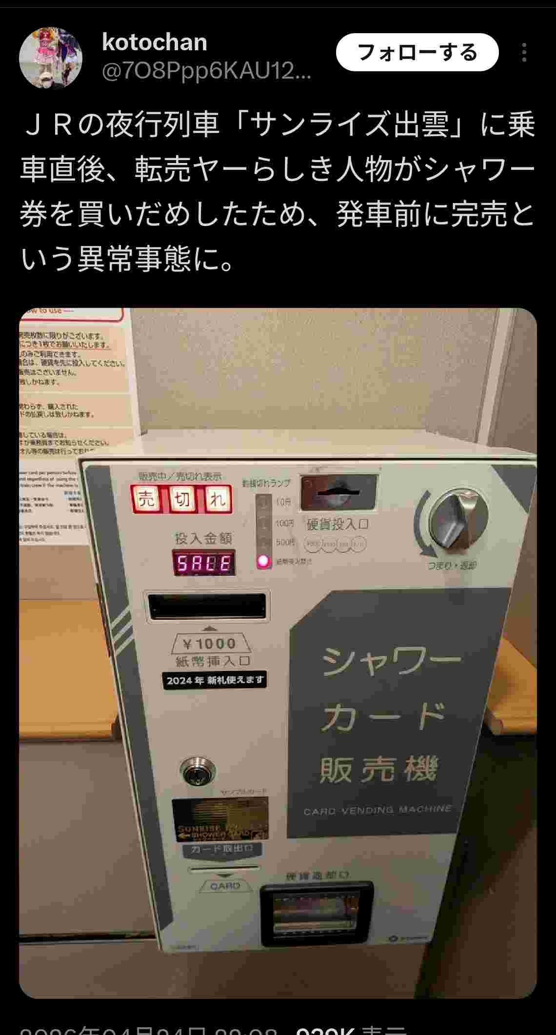 【訃報】夜行列車のシャワー券を買い占めて転売する最強のビジネスモデルが爆誕する🤔