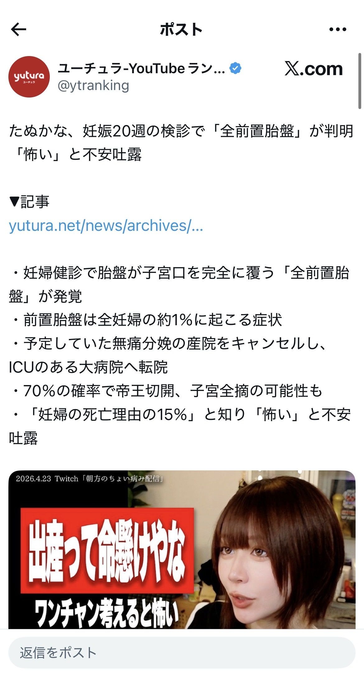 - マジレスすると発覚してる前置胎盤ならむちゃくちゃ手厚くフォローされるからむしろ安全まであるやろ