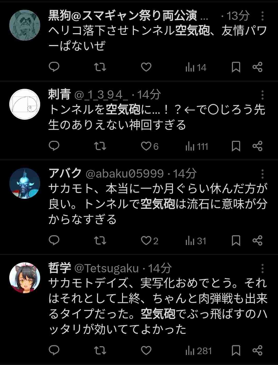 - トンネルを空気砲にっていうのはこのやられたやつの推測で実際はただめちゃくちゃ強い風が吹いてきただけや