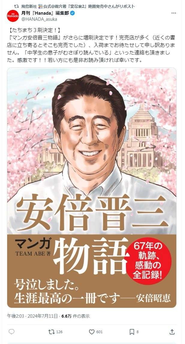 - 「中学生の息子がむさぼり読んでいる」『マンガ 安倍晋三物語』安倍元首相の命日に話題 フィクション小説『暗殺』も文芸書で1位[ノンフィクションベストセラー]