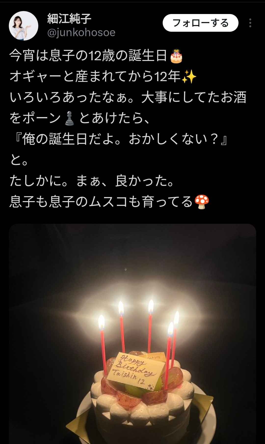 女性の方「息子の12歳の誕生日。息子のムスコも育ってる🍄」www