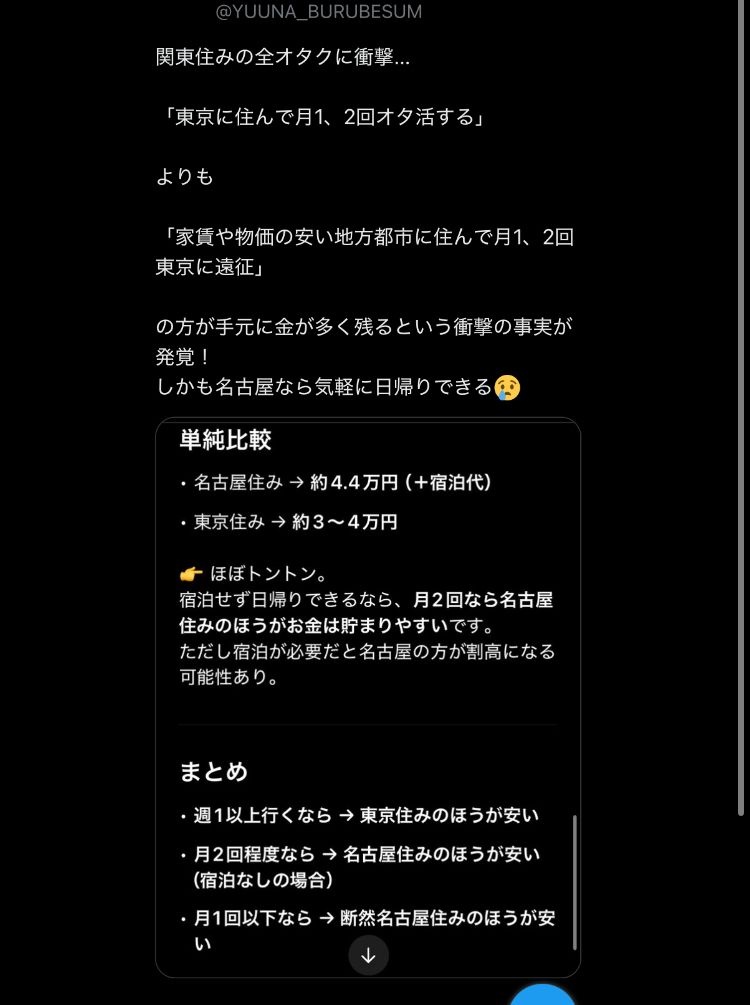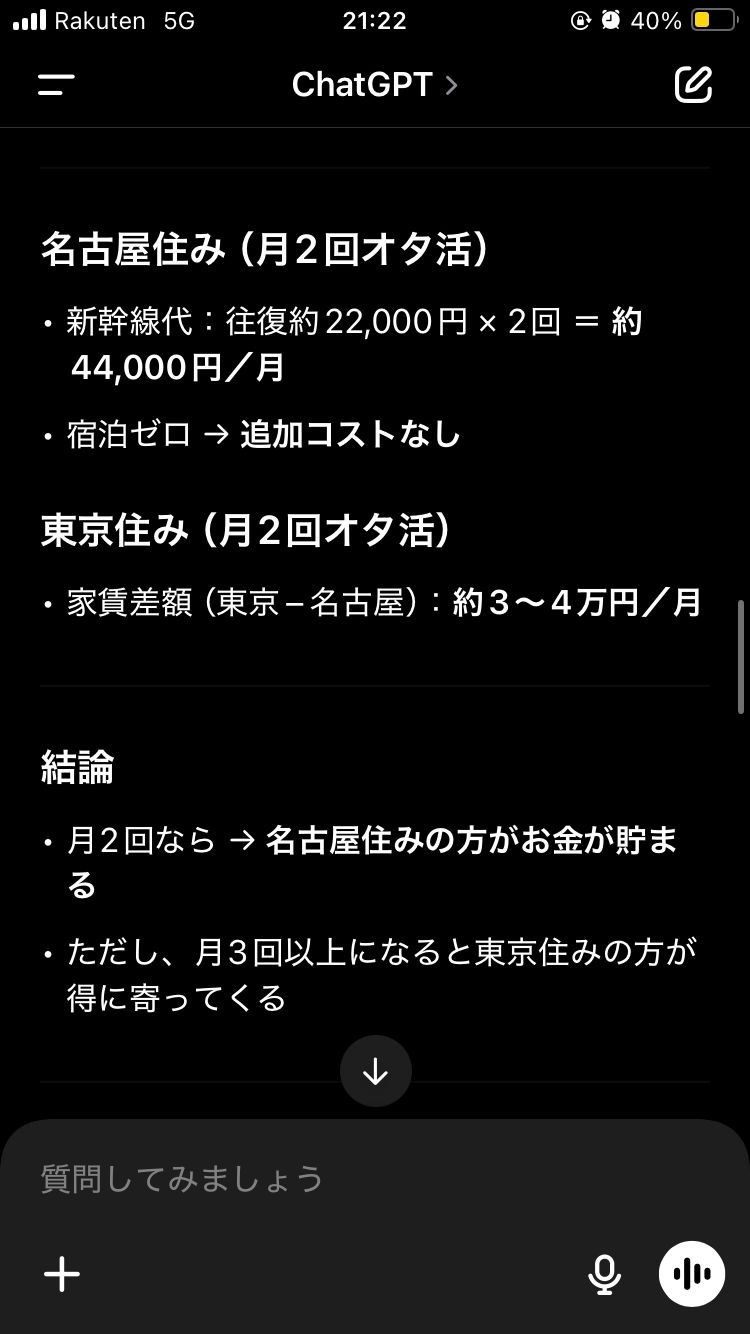 - 月に新幹線代44000円と宿泊費かかって名古屋の方が金貯まるってそうはならんやろ