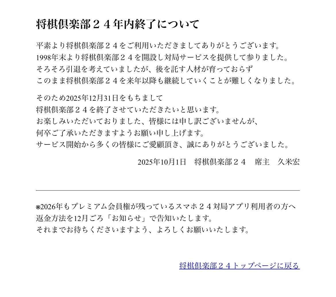 【緊急🚨】1998年から続いてきた「将棋倶楽部24」、サービス終了へwww
