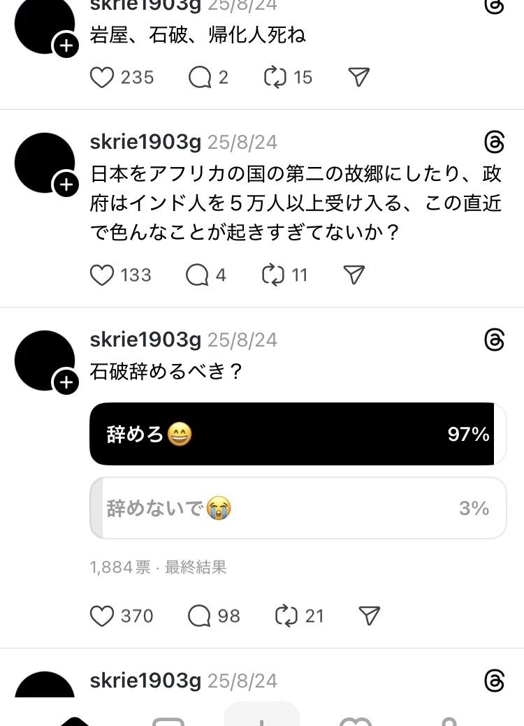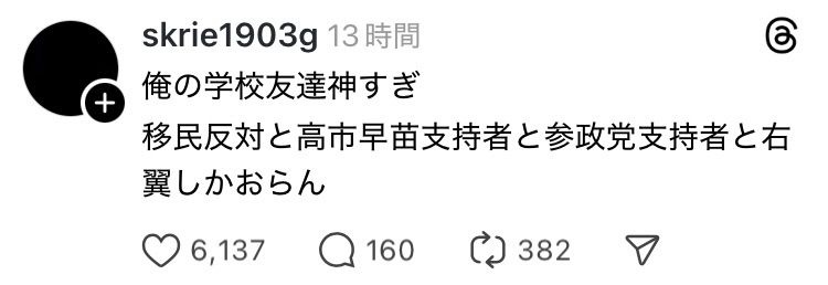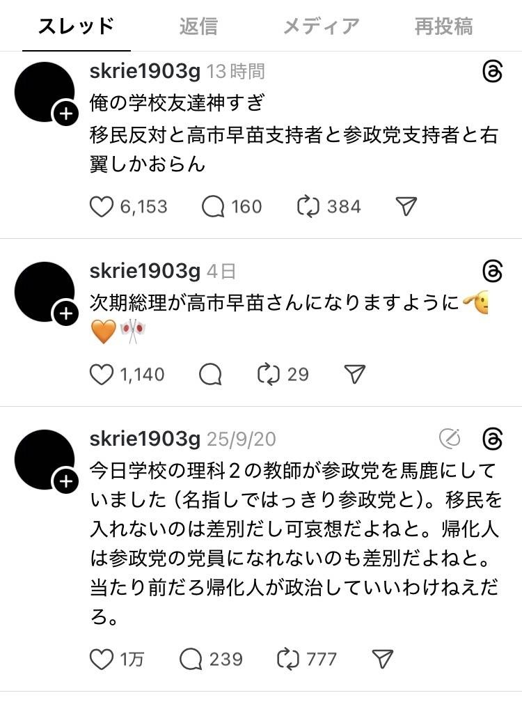 中学二年生「俺の学校友達神すぎ🤣 移民反対と高市早苗支持者と参政党支持者と右翼しかおらん🥰」1万いいね!!!