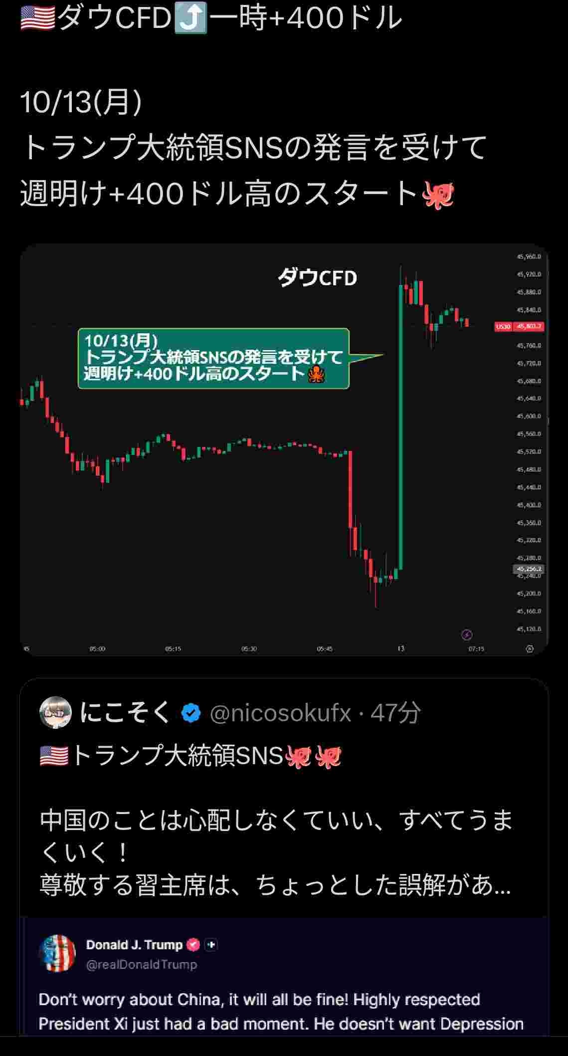 自分の一言で乱高下できるんだからトランプ周辺が負けるわけが無い - 29 : 2025/10/13(月) 07:57:11.236 ID:CYFN/Oegr